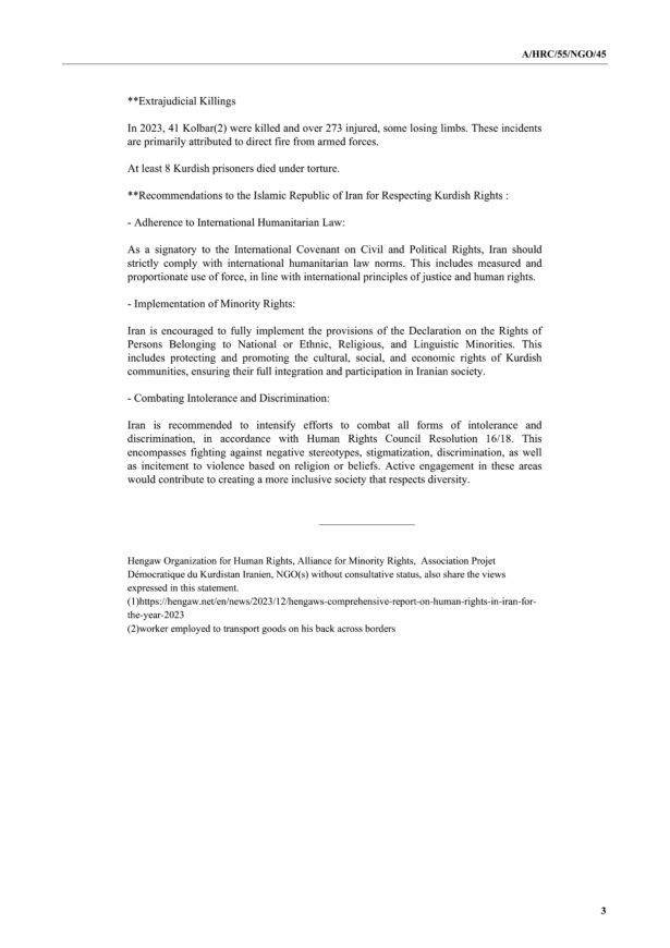 Hengaw Organization for Human Rights, Alliance for Minority Rights, Association Projet Démocratique du Kurdistan Iranien, NGO(s) without consultative status, also share the views expressed in this statement.