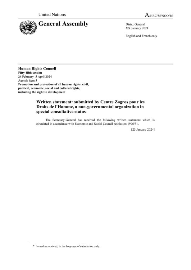 Written statement* submitted by Centre Zagros pour les Droits de l’Homme, a non-governmental organization in special consultative status