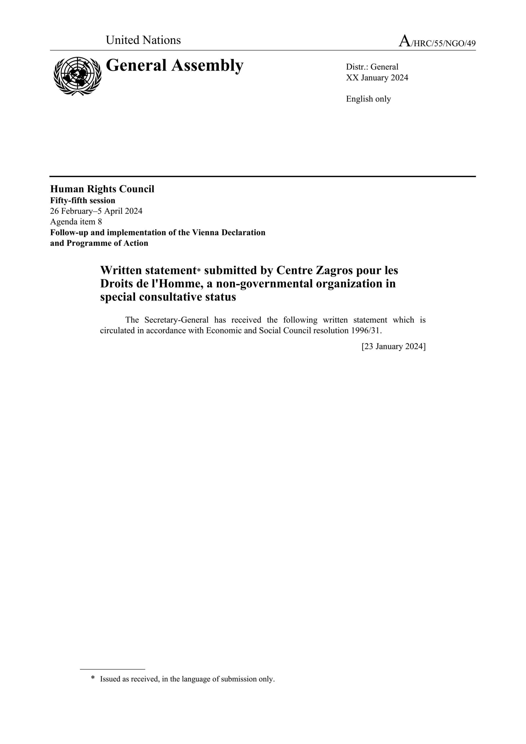 Written statement* submitted by Centre Zagros pour les Droits de l’Homme, a non-governmental organization in special consultative status