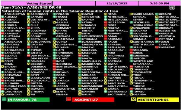 Le 18 décembre 2025, l’Assemblée générale des Nations Unies a de nouveau adopté sa résolution annuelle relative à la situation des droits de l’homme en République islamique d’Iran (A/80/545 DR 48). La résolution a été adoptée par 78 voix pour, 27 contre et 64 abstentions, confirmant que la majorité de la communauté internationale demeure préoccupée par la situation des droits humains en Iran.